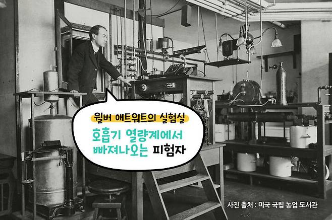 미국의 생리학자였던 윌버 애트워트(Wilbur O. Atwater)가 1896년 4,000여 가지 음식의 칼로리를 측정해 얻은 평균 값입니다. 그는 '증기 기관차가 석탄을 태워 움직이는 것처럼 인간도 음식을 태워 움직인다'라고 생각했어요. 그래서 1L의 물을 데워 1℃ 높이는데 필요한 에너지가 1kcal로 정의됩니다.