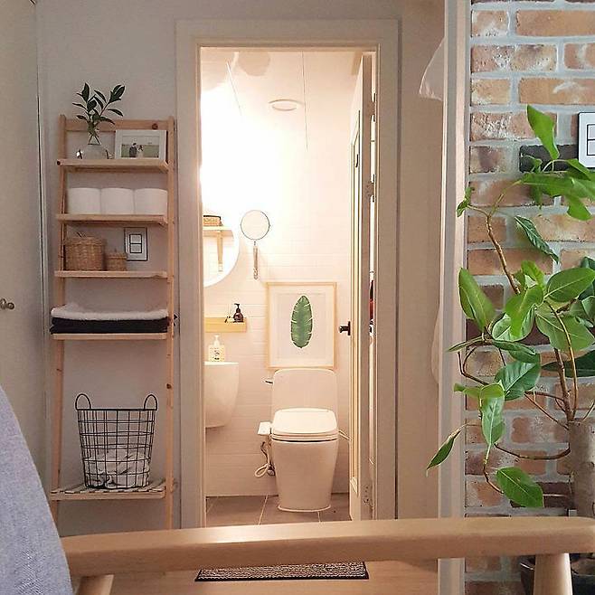 변기 : 이누스 / 시계 : 위메프 / 세면대 : 대림 / 책상 : 블루밍홈 / 화분 : 고무나무 / 욕실선반 : 마켓비 / 서랍장 : 바네스데코 / 세계지도액자 : 까사드제리 / 액자 : 다이소, 더가든팩토리 / 의자, 사다리선반 : 아리아퍼니쳐 / 네트망, 욕실변기 위 액자 : 다이소 / 잡지꽂이, 빨래바구니 : 문고리닷컴 / 욕실벽등, 미니거울, 욕실벽거울, 스탠드 조명 : 이케아