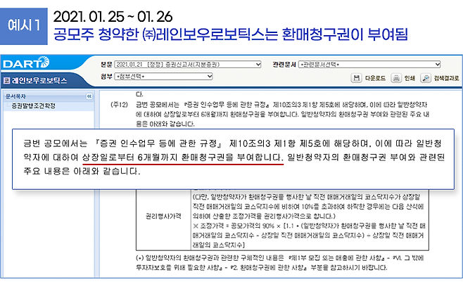 이 증권신고서 안에 환매청구권이 부여되었는지, 부여되지 않았는지가 명시되어 있으니 공모주 청약 전 확인하는 게 좋겠죠. 내용이 너무 많아 찾기 어렵다면 ‘환매‘라고 검색해서 그 내용을 검토해보세요.