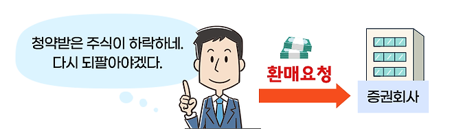 즉, 공모주환매청구권이란 공모주 청약을 하여 배정받은 주식을 보유하고 있는 주주가 상장 후 주가가 하락할 경우 증권회사를 상대로 청약받았던 주식을 다시 되사달라고 요청할 수 있는 제도입니다.