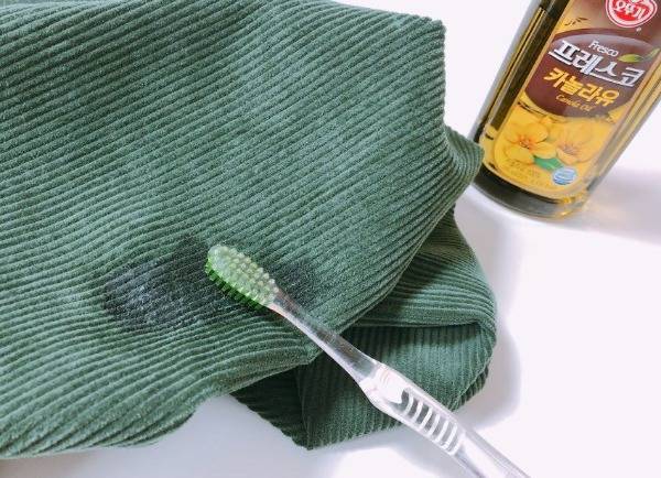 식용유는 그냥 부어만 두면 안됩니다. 칫솔의 도움을 받기로 합니다. 껌이 붙은 자리에 식용유를 부은 뒤 칫솔로 살살 문지릅니다. 녹은 껌을 벗겨내는 거예요. 얼음으로 굳혀 떼어내는 것보다는 나았습니다. 적어도 코르덴 소재가 함께 떨어져 나오진 않았으니까요.