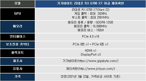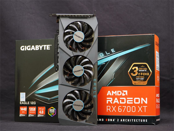 당초 노렸던 QHD 해상도의 RTX 3070 대응에는 조금 미진하지만, 순수한 성능만 따져볼 때는 나쁘지 않은 특성을 보여주었다. 게다가 칩도 작은 만큼 웨이퍼당 찍어낼 수 있는 물량도 많은 때문인지 한동안 레퍼런스 모델들만 출시되었던 상위 모델들과 달리 파트너사들의 커스텀 모델들도 동시 출시되고 있는데, 이번 기사에서는 기가바이트에서 만든 라데온 RX 6700 XT 이글(Eagle) 제이씨현 제품을 살펴본다.