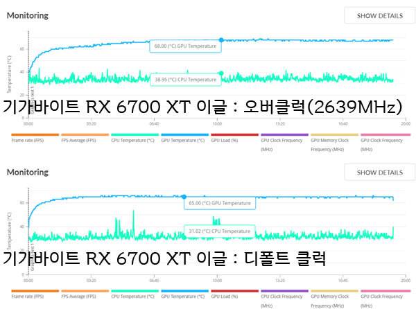 3DMark Time Spy Stress Test를 이용해 기가바이트 RX 6700 XT 이글의 GPU 온도를 측정했다. 디폴트(레퍼런스) 클럭 세팅에서는 최대 65℃온도를 기록했는데, 앞서 테스트한 레퍼런스 모델이 기록했던 약 75℃에 달하는 온도와 비교하면 10℃가량 낮아진 것.