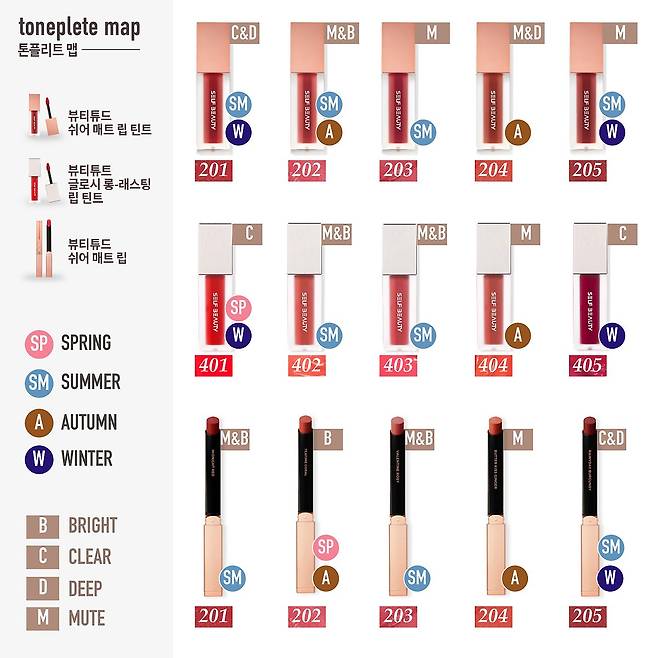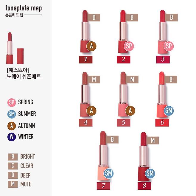 3월 출시되는 봄 컬렉션이어서 그런지 봄과 여름에 컬러가 5개나 분포되어 있어요. 톤도 01호를 제외하고 뮤트와 브라이트 톤에 집중되어 있고요. 차분하거나 맑고 생기 있는 이미지를 연출할 때 사용하기 좋은 컬러들이에요~ 딱 봄 날씨에 어울리는 컬러들로 잘 뽑은 것 같아요.