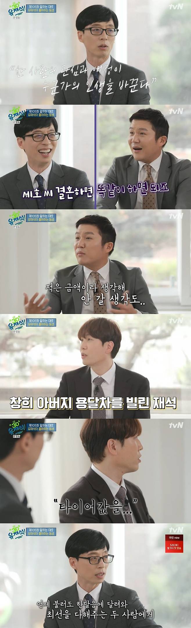 이날 조세호와 남창희는 유재석 하면 빼놓을 수 없는 '미담'을 공개했다. 조세호는 '양배추' 시절 촬영장과 집이 멀어서 움직이기 힘든 자신을 근처까지 데려다주고, 차비로 10만 원까지 줬던 유재석에게 미안함과 고마움을 털어놨다. 그는 "내가 결혼식 날 축의금으로 5만 원을 냈다. 적은 금액이라 생각해서 안 갈까 생각하다가 밥값이 비싸다고 해서 축의금 내고 밥 안 먹으면 된다고 생각해서 그냥 나왔다"며 "내가 축의금 두 배로 차비를 받으면서 '이 사람에게는 내가 할 수 있는 최선을 다해보자'라는 생각을 했다"고 말했다. 이에 유재석은 "몰랐다. 내가 조세호 결혼할 때 똑같이 하면 된다. 물가 상승률 감안해서 하겠다"고 농담해 웃음을 자아냈다.