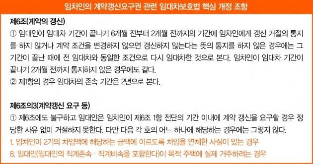 2020년 12월 시행된 개정 주택임대차보호법 제6조의 3에 따르면 임대인은 임차인이 계약 갱신을 요구할 경우 정당한 사유 없이 이를 거부할 수 없다. 다만 예외적으로 임대인이 목적 주택에 실제 거주하려는 경우에는 거부할 수 있다.
