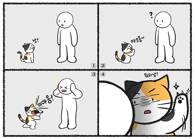 이때는 고양이가 울 때 보이는 행동과 울음소리의 높낮이 등 다양한 상황을 종합해서 어떤 의미인지 유추해야 합니다. (집사는 탐정왕🧐)