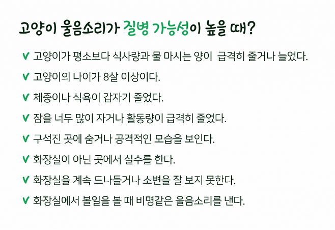 단순히 우는 것이 아니라 어딘가 몸이 불편하거나 질병일 가능성이 있습니다. 고양이의 울음소리에는 다양한 이유가 있을 수 있으니 행동이나 컨디션을 잘 살피는 것이 중요해요!