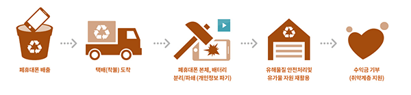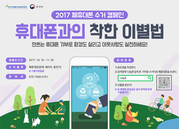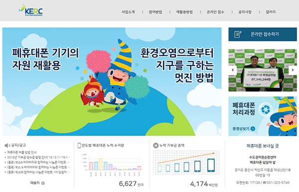 해당 조합을 통해 폐휴대폰 본체 외에도 충전기나 여분의 배터리를 함께 배출할 수 있다. 당연히 스마트폰의 파손 여부나 기종은 관계없이 배출 가능하며, 특히 파쇄하는 과정에서 개인 정보 유출을 원천 방지할 수 있어 안심할 수 있는 것도 장점이라 할 수 있다. 참고로 기부금 영수증 신청도 가능하다.