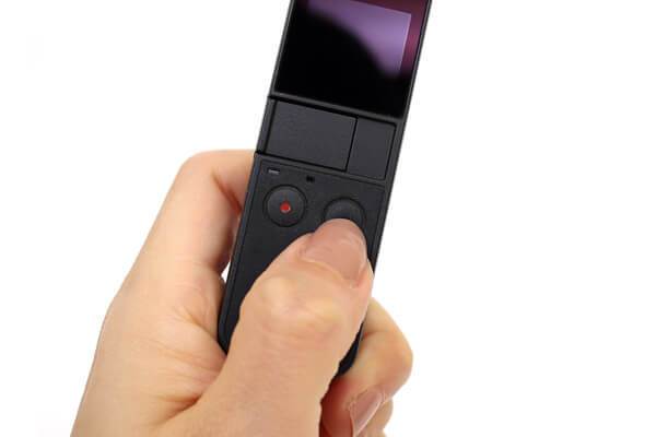 오즈모 포켓의 2개의 버튼 중 왼쪽 버튼은 빨간 점이 그려져 있는 것만 봐도 알 수 있듯 촬영 버튼이다. 오른쪽 버튼은 전원 겸 각종 모드 변경 버튼으로, 오즈모 포켓을 컨트롤하는 메인 버튼이라 보면 된다. 오즈모 포켓을 실행하기 위해 오른쪽 버튼을 길게 눌러봤다. 3축 짐벌답게 딱 3회의 카메라 위치 조정(카메라 단독 위치 조정1회 추가)이 이뤄지며, 동시에 오즈모 포켓을 가장 쾌적한 환경 하에서 사용할 수 있도록 기본 업데이트가 진행된다. 이때 사용자는 오즈모 포켓을 조작할 수 없으며, 버튼 바로 위에 위치한 LED가 빨간색-초록색으로 번갈아가며 점등된다.