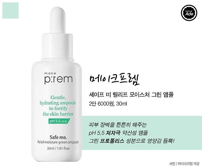 속 건조가 심한 수부지들에게 추천하는 앰플이다. 피부 본연의 힘을 키워주는 그린 프로폴리스 성분과 자연 유래 보습 성분인 프로판디올(20%)이 다량 함유됐다.