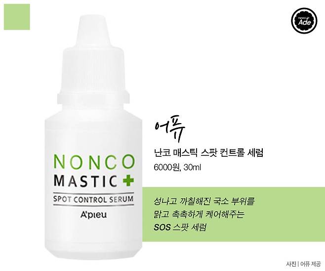 가성비 갑 어퓨의 스팟 세럼도 단연 입소문템이다. 보습과 진정이 뛰어난 매스틱 나무 수액(45ppm)이 들어 있다.