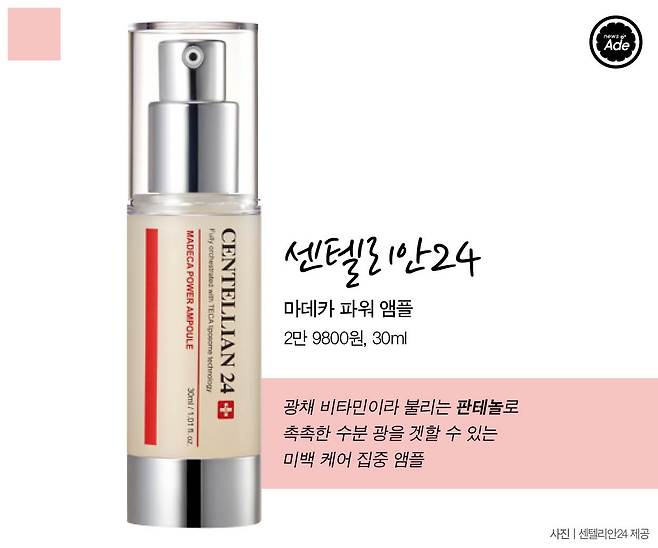 손상 피부 개선에 뛰어난 성분들이 농축된 앰플이다. 센텔라 정량 추출물, 세라마이드, 비타민, 판테놀이 함유됐다. 거칠어진 피부 결을 개선함과 동시에 화이트닝 효과를 볼 수 있다.