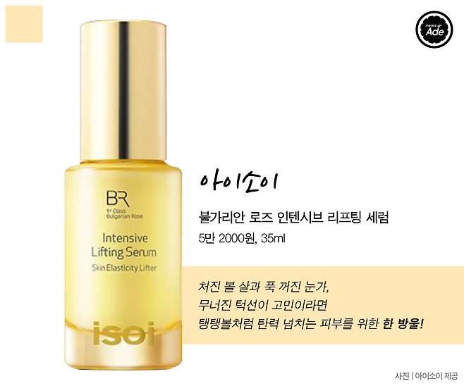 찐득하고 무거운 느낌 때문에 리프팅 제품을 꺼려왔다면 아이소이의 탄력 세럼이 제격이다. 끈적임 없이 흡수가 빠르고 즉각적으로 피부가 쫀쫀해지는 느낌이다.