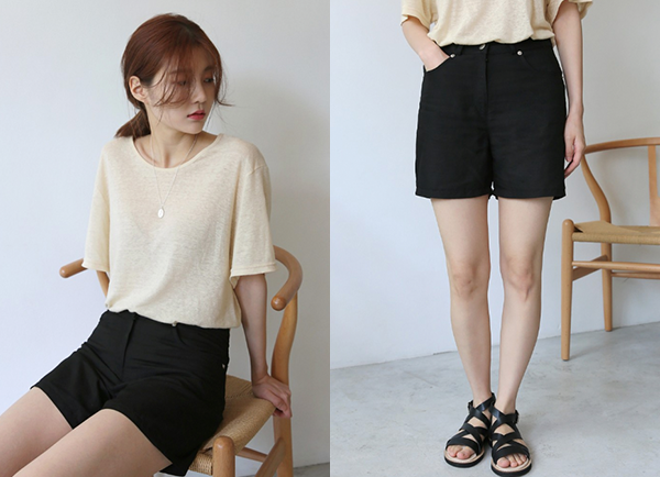 안정감있는 3.5부 기장의 검정 반바지에 아이보리 7부 티셔츠를 함께 코디하여 여리한 여름 데일리룩을 완성 해 보세요.