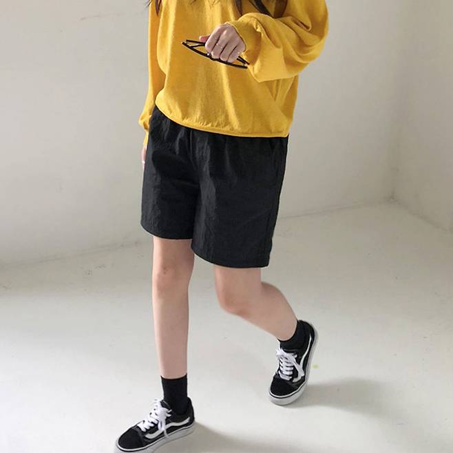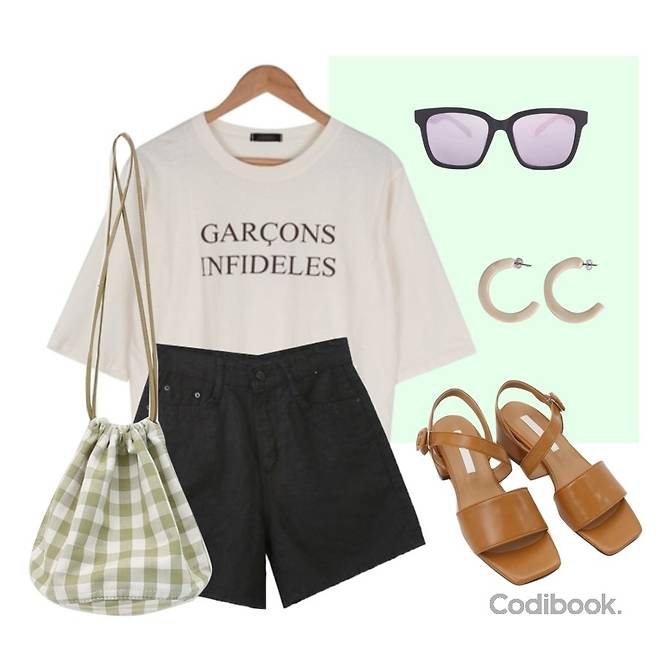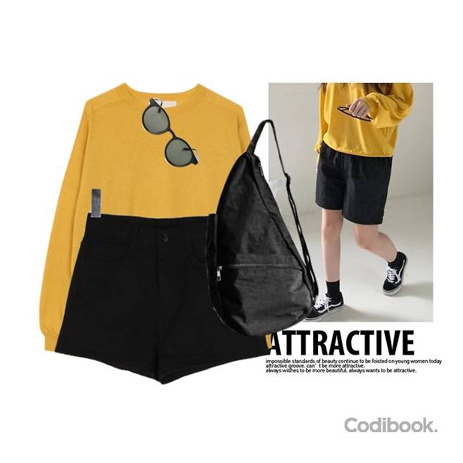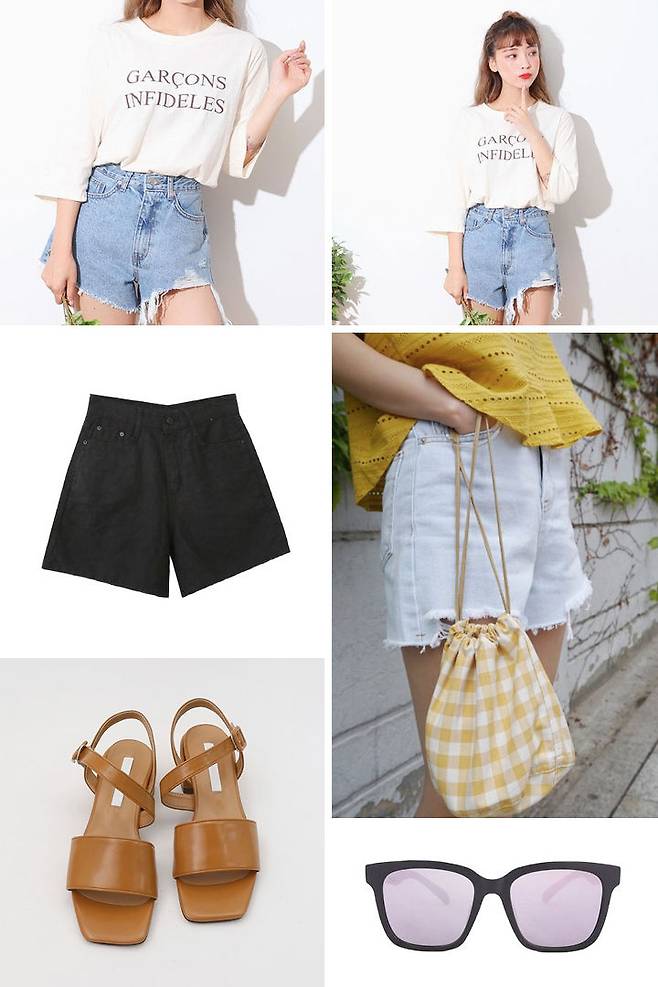 적당히 붙으면서 귀여운 느낌을 연출 하고 싶다면 이런 스타일의 티셔츠와 검정 반바지를 함께 코디 해 보세요.
