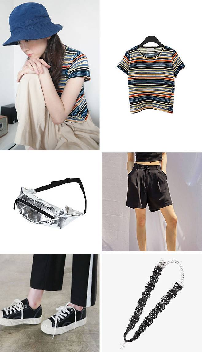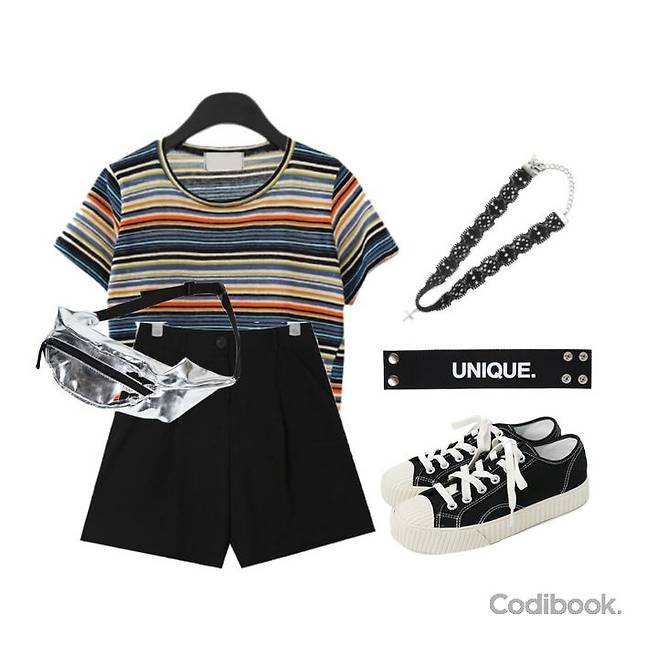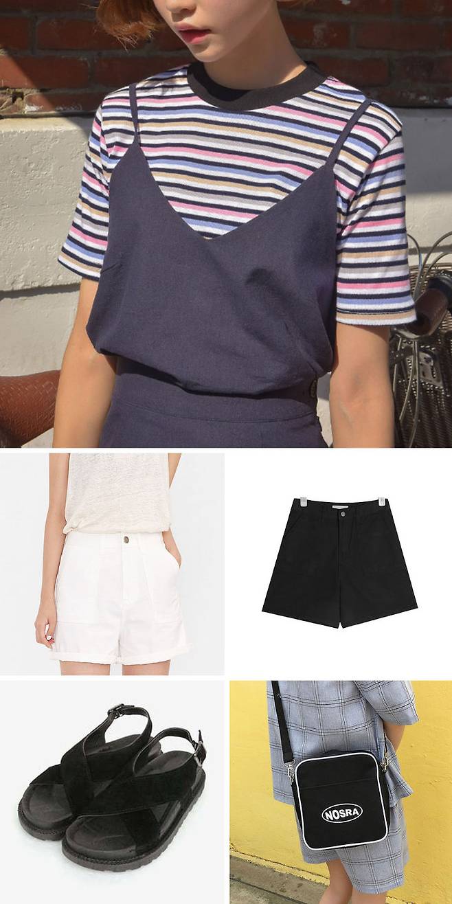 레트로한 디자인의 스트라이프 티셔츠에 검정 반바지를 매치하여 여름 데일리룩을 완성 해 보세요.