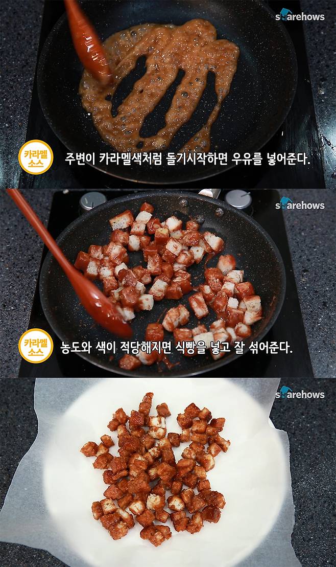 – 카라멜 색상이 나오면 구워두었던 식빵을 넣고 섞으면 완성!