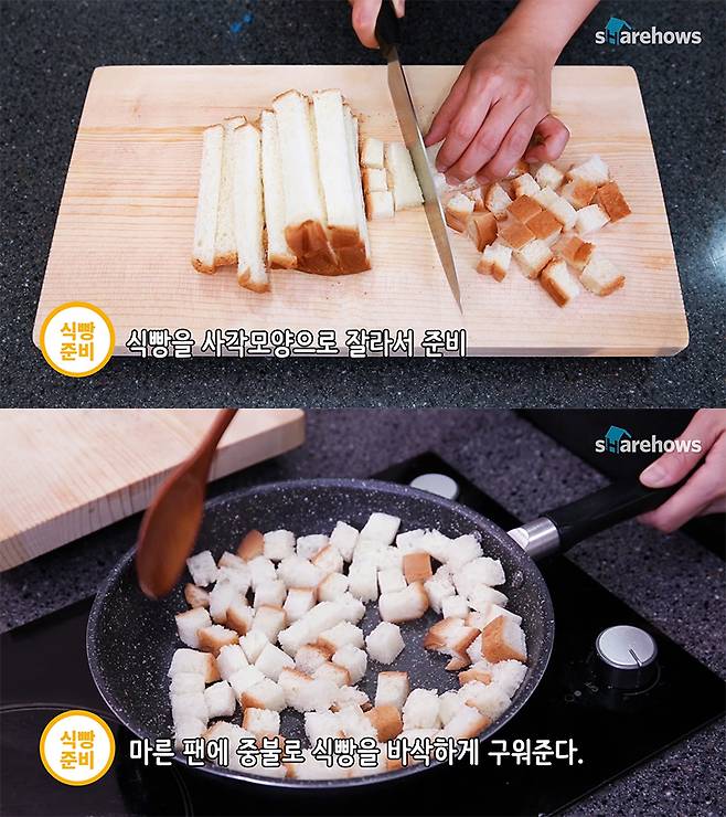 – 마른 팬에 중불로 노릇하게 식빵을 구워주세요 (5~10분 정도)