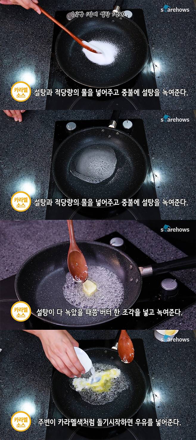 – 설탕과 적당량의 물(설탕보다 적게)을 넣고 중불에서 녹여주세요. 절대! 저어주지 말고 설탕이 녹을 때까지 기다려주세요.