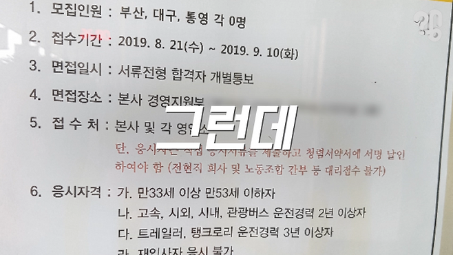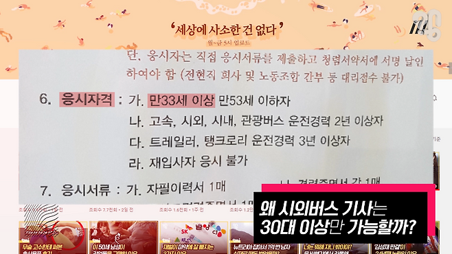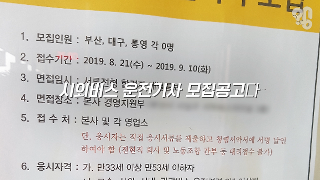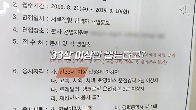 그리고 저희는 신입을 안 뽑고 무조건 경력직으로만 뽑아서, 시내버스 관광버스 기준으로는 2년 이상 경력에 맞는 나이가 30대쯤 이상 돼야 할 것 같아서 저희는 33세부터 모집을 합니다. 어린 분들이 적응 못 하고 퇴사율이 높은 것도 있어서 아마 그런 것 같습니다.