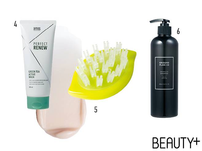 4 아모스 프로페셔널 퍼펙트 리뉴 그린티 액티브 마스크 딱딱한 두피에 활력과 보습을 부여해 탈모 증상을 완화시킨다. 꾸준히 사용하면 모발까지 부드러워지는 효과를 얻을 수 있다. 200ml 3만6000원. 5 DHC 스칼프 클렌징 마사지 브러쉬 샴푸할 때마다 사용하는 마사저. 두피에 달라붙은 피지를 탈락시키고 혈액순환에 도움을 준다. 8000원. 6 그라운드플랜 인헨서 샴푸 약해진 모근에 수분과 영양을 공급하는 두피 샴푸. 약산성의 순한 샴푸로 전성분