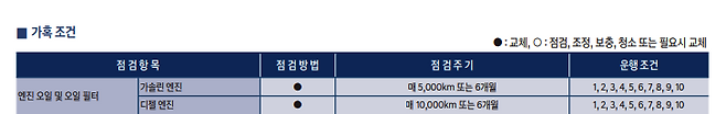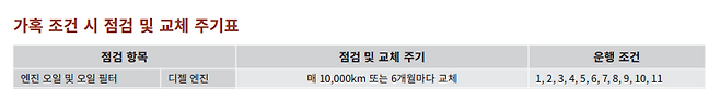 엔진오일의 경우 알려진 교환주기보다 조금 빠르게 교체해야 합니다. 현대자동차는 일반조건 10,000km/가혹조건 5,000km, 쌍용자동차는 일반조건 15,000km/가혹조건 10,000km를 권장하고 있습니다. 통상적으로 5,000km 정도가 앞당겨진다고 볼 수 있겠네요.