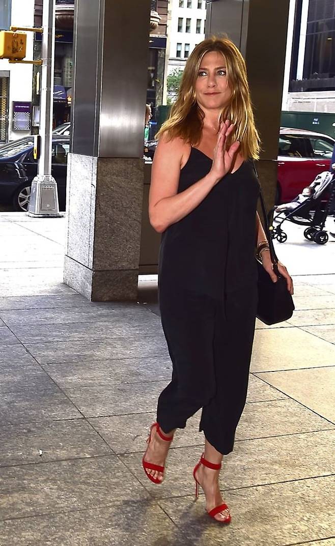 2016년 6월 제니퍼 애니스톤은 블랙 점프슈트에 레드 힐을 매치했다.