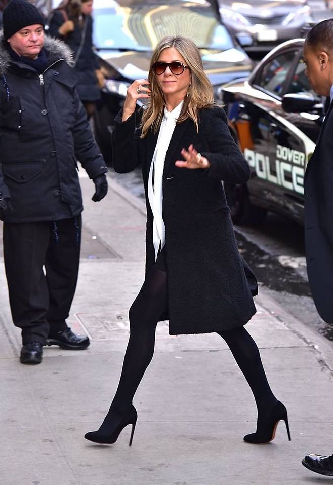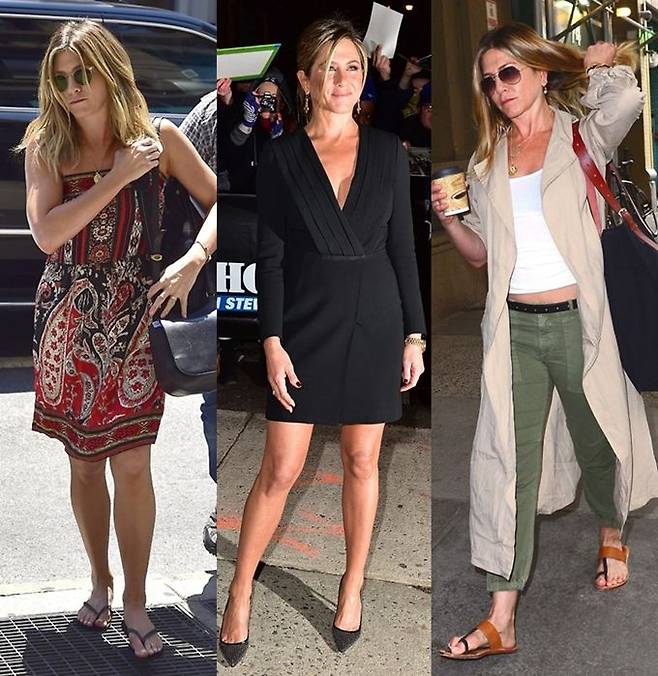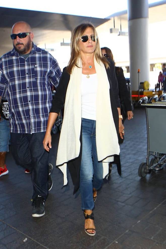 2016년 6월 제니퍼 애니스톤은 뉴욕 시내에서 화이트 티와 블랙 팬츠를 매치하고 오버사이즈 블랙 캔버스백과 토-루프 샌들로 편안한 일상룩을 연출했다.