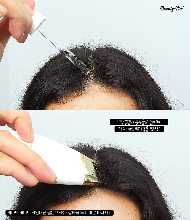 두피에 골고루 제품을 도포한 후 "바나브 타임머신 골든브러쉬 갈바닉 두피 이온 마사지기"를 두피에 가까이 가져간 후 빗어주면 시원~하게 자극이 되면서 흡수를 도와주니까 뿌리 볼륨은 물론 두피 관리에 더욱더 효과적인 #홈케어템