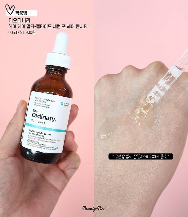 유럽잎갈나무추출물, 녹차 추출물 등 두피에 영양감을 전달해주고 굵고 탱글한 모발로 가꿀 수 있도록 도와주는 "디오디너리 헤어 케어 멀티-펩타이드 세럼 포 헤어 덴시티"