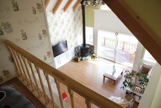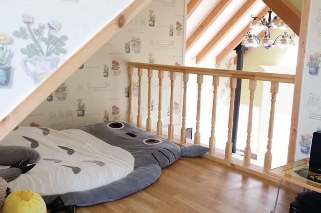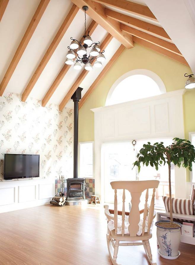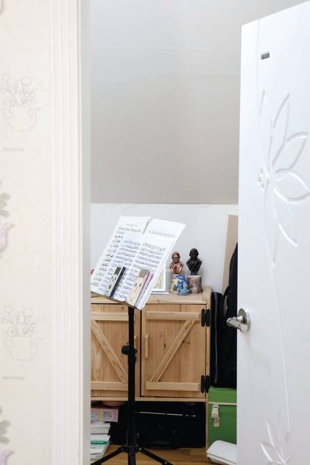 박공지붕의 특성인 높은 천장은 시원한 공간감을 제공하지만, 난방의 어려움이 있다는 단점도 있다. 건축주는 벽난로를 들여 단점을 메우고 거실의 분위기를 한층 끌어 올렸다. 천장 아래엔 딸을 위한 작은 공간을 마련해 악기 연주를 연습하고 쉬도록 만들었다. 곳곳에 눈을 즐겁게 하는 요소가 많지만 무엇보다 이 집의 화룡정점은 방이다.