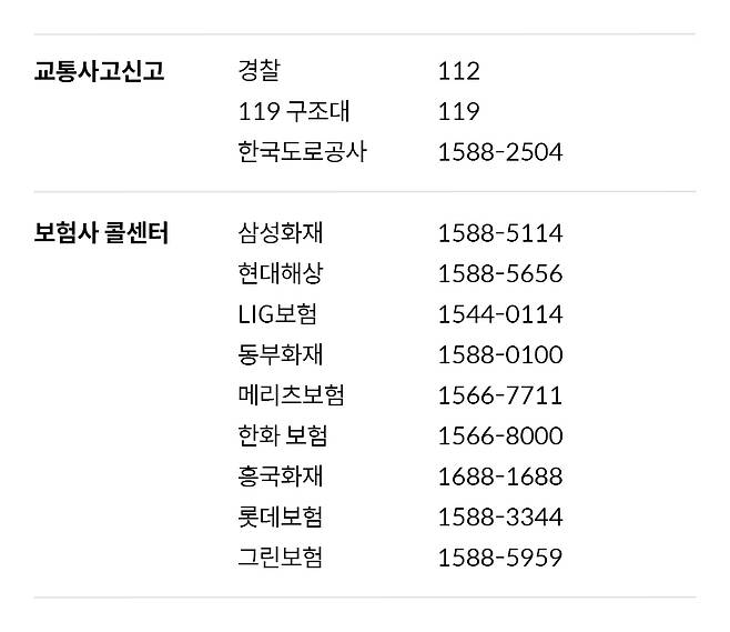 응급조치를 했다면 신속하게 경찰(112)이나 한국 도로공사(1588-2504)에 신고해 사고 위치와 피해상황을 알려야겠죠.