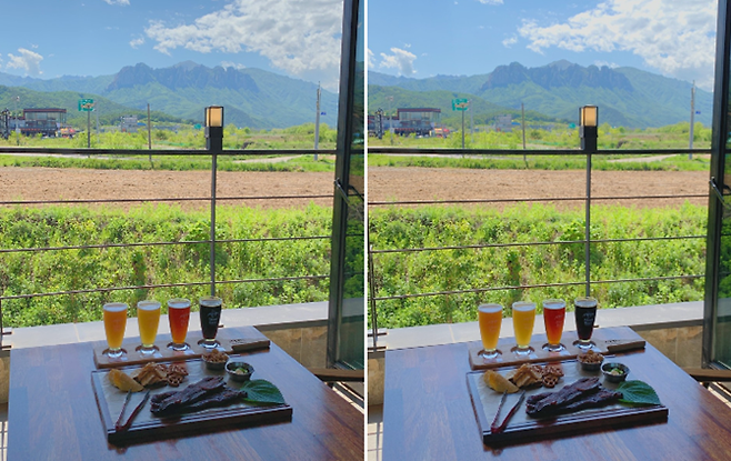 바로 파란 하늘 아래 저 멀리 보이는 설악산 울산바위다. 그리고 결정 장애를 위한 메뉴, 혹은 주량에 자신 있는 사람들이 자신에게 꼭 맞는 맥주를 찾기 위한 애피타이저, 샘플러.오직 이곳에서만 맛볼 수 있는 망고쉐이크 IPA와 스트로베리에일, 그리고 비엔나 스타우트와 메이플에일로 골라봤다. 가장 궁금했던 망고쉐이크 IPA는 뽀얗고 밝은 노랑빛에 과일주스 같은 모습이었다. 마셔보니 역시나 쓴맛은 적고 매우 부드러워 꼭 알코올이 들어간 망고쉐이크를 먹는 것 같다. 스트로베리에일은 요즘 편의점에서 파는 과일향 맥주와 같을까 생각했지만 차원이 달랐다. 진짜 딸기 과즙을 추출해서 넣은 맥주답게 딸기맛이 맛, 향, 촉감으로 느껴졌다. 쓴맛이 거의 없어서 평소에 맥주를 잘 못 마시는 사람들도 사랑에 빠질 맥주들이다. 붉은 단풍잎을 닮은 색을 가진 메이플에일은 깊고 묵직한 풍미를 낸다. 의외로 필자를 사로잡은 맥주는 비엔나 스타우트였다. 검고 거친(?) 외관에 비해 매우 부드러운 바디감에 쓴 초콜릿과 맥주의 진한 맛이 느껴진다.