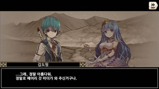어딘지 익숙한 화면과 어딘지 익숙한 디자인, 게임을 켜자마자 느낌이 옵니다. 그 시절 그렇게 했던 일본식 RPG의 바로 그 느낌. 거기에 동화를 휘핑하면 이런 느낌일까요?