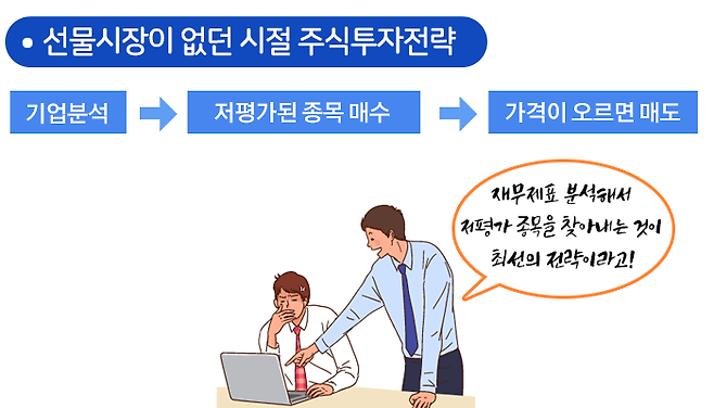 선물시장이 없던 시절에 주식투자전략은 무척 단순하였습니다. 기업을 분석하고 저평가된 종목을 발굴하여 매수 후 가격이 오르면 이익실현, 즉 매도하는 것입니다.