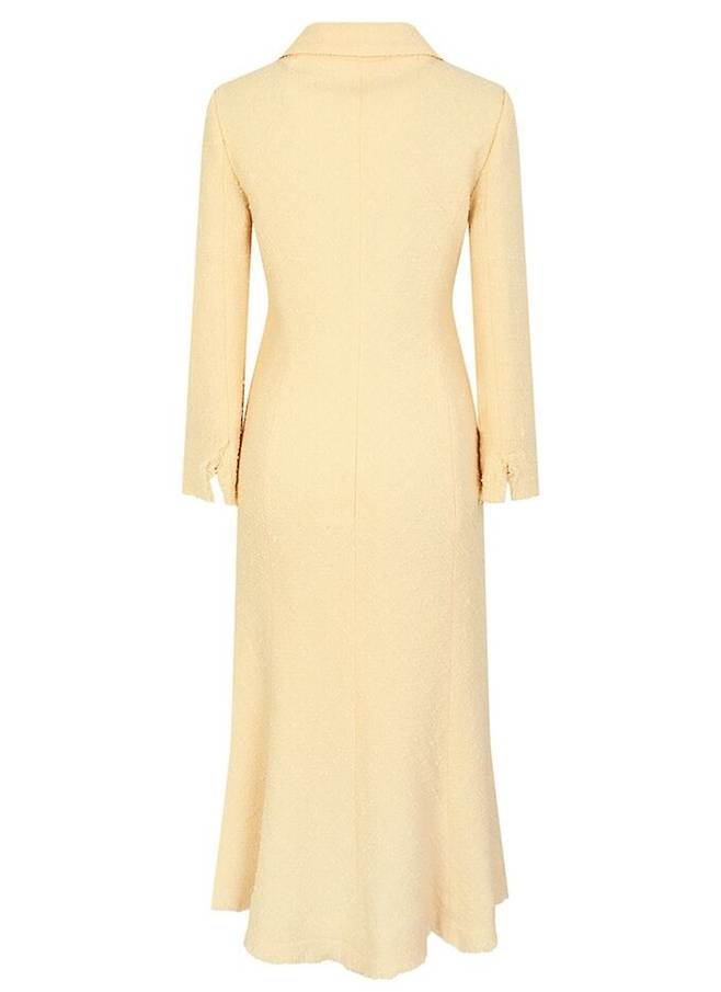 페미닌한 머메이드 실루엣의 원피스로 더블 칼라의 브이넥 디자인에 버튼 디테일이 특징이며 여성스럽고 러블리한 스타일을 연출할 수 있다.