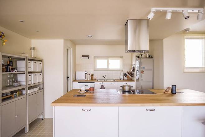 저희는 거창하게는 아니더라도 음식을 함께 만들어 먹는 시간을 자주 갖길 원했어요. 채식주의자인 우리 부부는 채식을 시작하며 요리에 관심을 두게 되었어요. 그래서 함께 요리하기 편한 주방을 만들고 싶었죠. 리모델링 업체 실장님과 여러 차례 이야기를 나눈 후 주방과 알파룸 공간을 활용하여 널찍한 아일랜드 조리대를 만들기로 했어요.