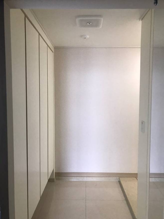 원래 드레스룸과 침실 화장실로 가는 길엔 문이 없었어요. 전 이곳과 침실을 분리하고 싶었는데, 마침 팀장님도 같은 제안을 해주셔서 정말 좋았죠. 붙박이 화장대를 철거한 자리엔 이불장과 청소도구함을 설치했어요.