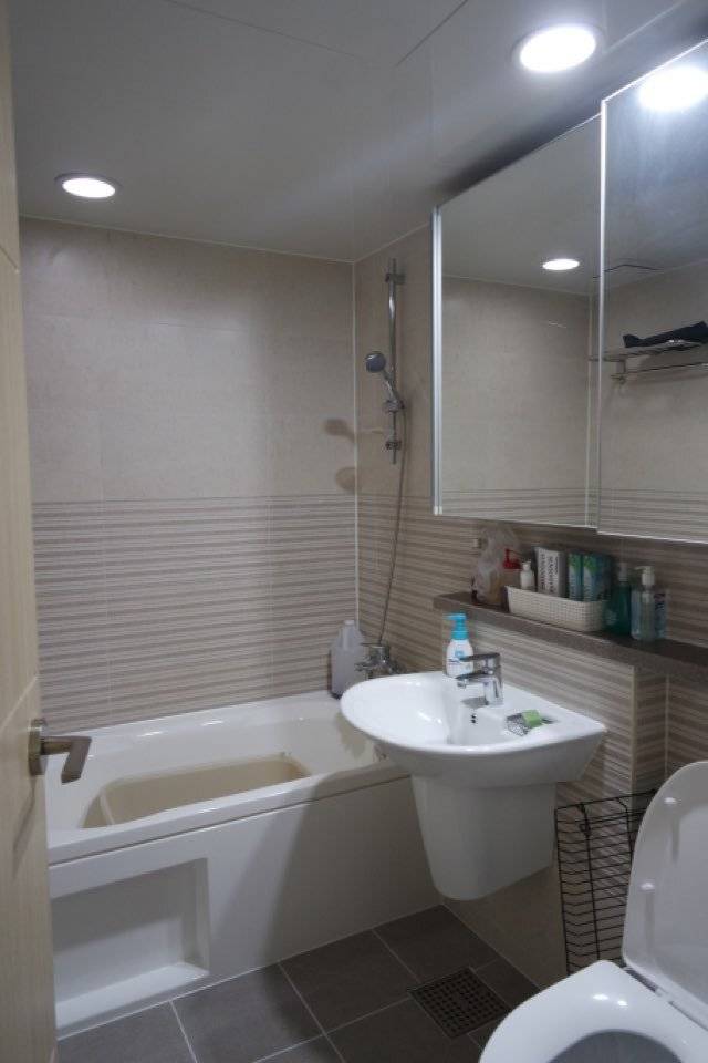 거실 욕실입니다. 예전에 어느 비지니스 호텔 욕실의 색감이 인상적이라 나중에 비슷한 컨셉의 욕실을 만들어 보고 싶다고 생각했어요. 마침 실장님도 우리 집 분위기엔 무게감 있는 톤의 욕실을 추천한다고 하셔서 만족스러웠어요.
