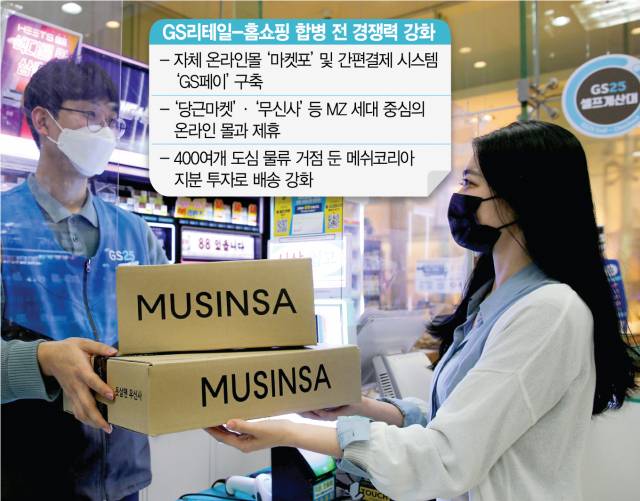 GS리테일(007070)이 홈쇼핑과의 합병을 앞두고 온라인 영토 확장과 배송 역량 강화에 속도를 내고 있다. 온라인 중고거래 1위인 당근마켓에 이어 1020대 고객이 70%가 넘는 MZ세대(1980년대 초~부터 2000년대 초 출생한 세대)의 대표적인 온라인 패션 플랫폼 '무신사'와 전략적 제휴를 맺고 미래 고객 확보에 나섰다. 무신사 상품의 오프라인 판매는 물론, 배달과 택배 서비스에도 힘을 합치기로 했다. 동시에 GS홈쇼핑(028150)은 물류 스타트업 '메쉬코리아'에 지분을 투자하며 배송 서비스를 강화한다. 1만 5,000여개 GS리테일 오프라인 거점에 메쉬코리아 배송 기사들의 역량을 합쳐 라스트마일에 특화된 배송 서비스를 선보인다는 계획이다.