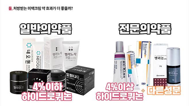 일반의약품은 하이드로퀴논 4% 이하의 단일제제 해당하고, 전문의약품은 4% 이상의 하이드로퀴논에 다른 성분이 포함된 복합제제가 있어요.