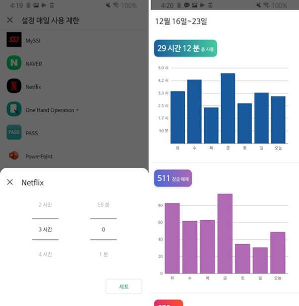 > 지난 7일간의 사용 시간 및 잠금 해제 기록을 통해 심리적으로 스마트폰 사용을 방지하고 있다