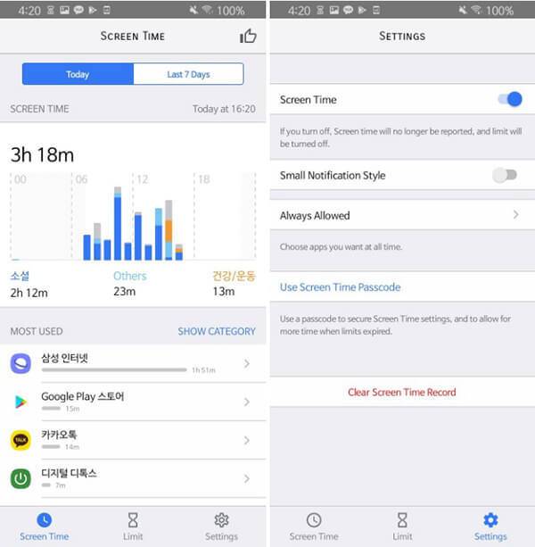 애플의 스크린 타임과 이름부터 구성까지 너무 닮은 탓에 독창성은 지나치게 떨어진다. 그러나 완성도 높은 스크린 타임의 기능을 그대로 가지고 왔으니 사용자 평가가 꽤 후하다. 전반적으로 군더더기 없고 사용이 쉬운 디지털 웰빙 앱을 찾는다면, Screen Time을 추천한다. 대신 한국어는 지원하지 않으니 참고하자.