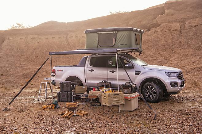 와일드트랙은 다소 평범하다. 오프로드 감성과 최신 SUV의 감각을 적절히 섞었다. 굵직한 선과 높은 벨트라인으로 강인한 이미지를 연출했고 앞문 아래엔 와일드트랙 레터링을 넣어 심심함을 덜었다. 포드가 이번 행사에서 전시해 놓은 와일드트랙 모델은 루프탑 텐트와 캠핑 장비로 꾸며 아웃도어 활동에 어울리는 콘셉트를 선보였다.