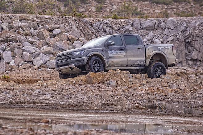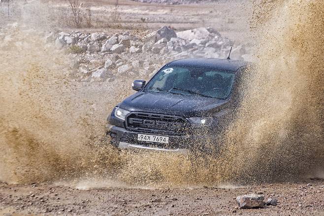 이 덕분에 랩터는 오프로드 주행에서 한마디로 ‘날아 다녔다.’ 비유적 표현이 아니라 정말로 네 바퀴가 땅을 박차 올랐다. 대략 500m 가량 쭉 뻗은 오프로드 길 가운데, 약간의 언덕이 있었다. 인스트럭터의 ‘풀악셀’ 주문에 가속 페달을 끝까지 밟았다. 약 시속 80㎞까지 속도가 붙었고 그 상태로 언덕을 뛰어넘었다. 마음을 다잡고 출발했지만 비명이 튀어 나왔다. 난리 난 운전석과 달리 랩터는 남다른 서스펜션과 탄탄한 차체 덕분에 안정적으로 착지했다. 이후에도 랩터는 85㎝ 수심 도강과 45° 기울인 사면로, 32.5°의 경사로 등판, 바위를 타고 넘는 ‘락크라울링’ 등 다양한 코스에서 오프로드 실력을 뽐냈다.