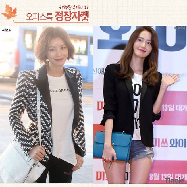 베이직한 정장자켓은 언제나 세련되고 매니쉬한 느낌을 줄 수 있는 코디 아이템이죠. 포멀한 느낌을 줄이기 위해서는 이너 선택을 캐주얼하게 하는 것이 중요해요.