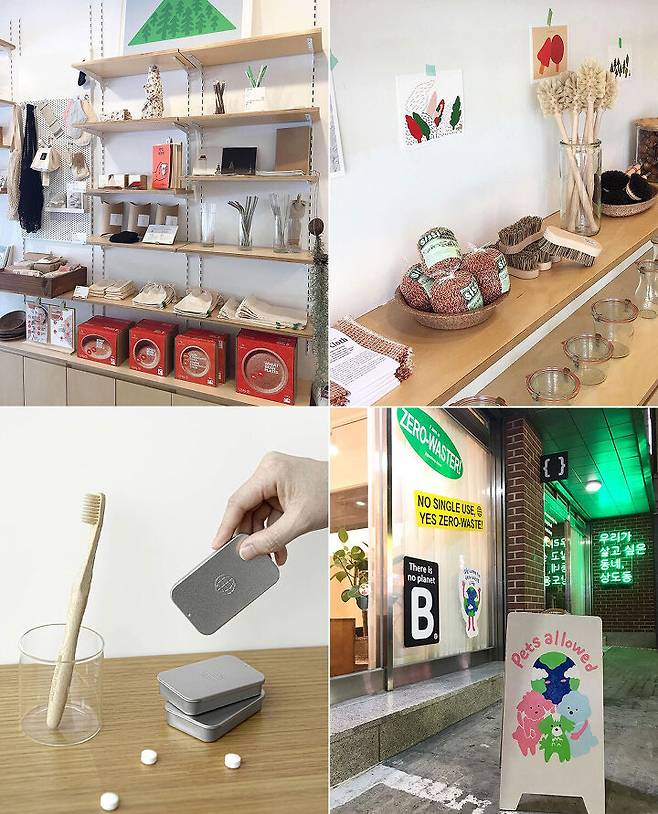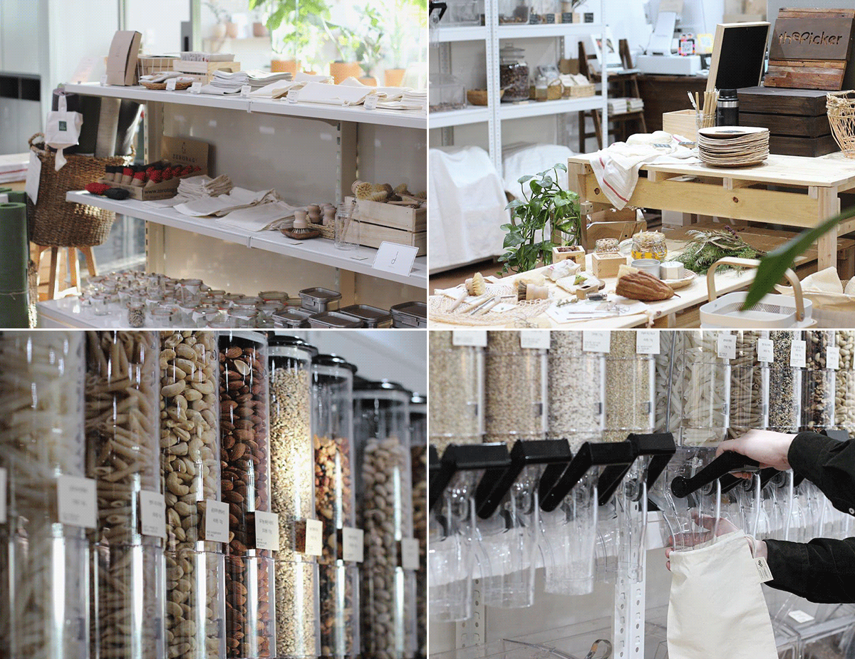 국내에서 처음으로 제로 웨이스트 가게를 선보인 ‘더 피커’의 매장 한 쪽에는 병아리콩, 카카오닙스, 각종 견과류 등 다양한 곡물 판매 코너가 마련되어 있다. 하지만 어디에도 곡물을 담아갈 일회용 봉지는 찾아볼 수 없다. 봉지 대신 소비자가 직접 다회용 용기나 주머니를 가져와 필요한 만큼만 담아 구매하는 시스템으로 운영된다. 과대포장에 익숙한 소비를 지양하기 위한 것이다. 용기를 가지고 오지 않았더라도 현장에서 판매하는 유리 공병이나 가방을 사서 담아갈 수 있다. 일회용품 사용을 줄일 수 있을 뿐 아니라 소량으로만 구매 가능하다는 것 역시 큰 장점이다. 매장에는 식료품 말고도 스테인리스, 대나무나 유리로 만든 다회용 빨대, 진짜 수세미 열매를 말려 만든 천연 수세미와 곡물로 만든 친환경 그릇도 판매해 호기심을 자극한다.