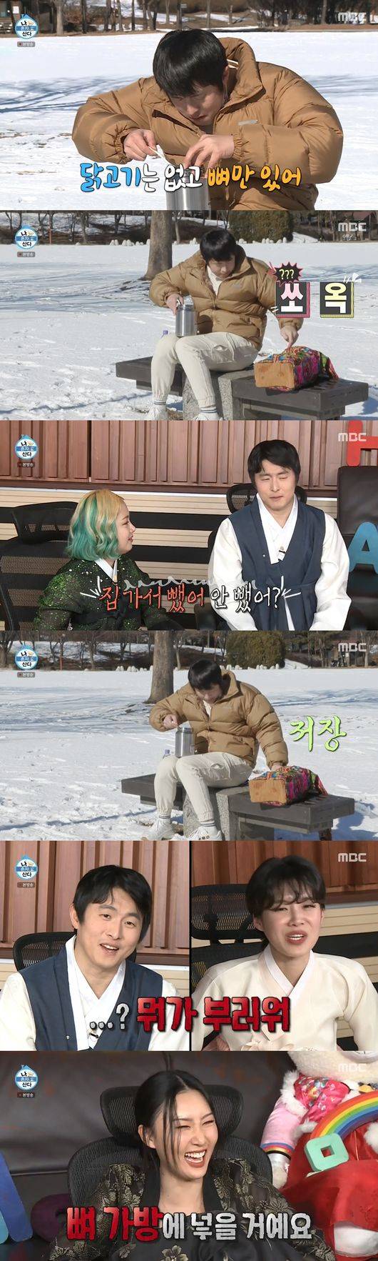 기안84는 닭볶음탕 볶음밥을 먹다가 나온 닭뼈를 가방에 아무렇지 않게 넣어 주위를 폭소케 했다. 박나래는 "집에 가서 뼈 뺐나. 가방에서 뼈 나오면 사람들이 오해할 수 있다"라고 말해 주위를 폭소케 했다. 기안84는 바지에 양념이 묻자 바닥에 있는 눈으로 바지를 닦기 시작해 주위를 웃음바다로 만들었다. 장도연은 "부럽다. 저렇게 살면 좋을 것 같다. 나도 다음엔 뼈다귀해장국 집에 가서 뼈 가방에 담아 올거다"라고 말해 주위를 폭소케 했다.