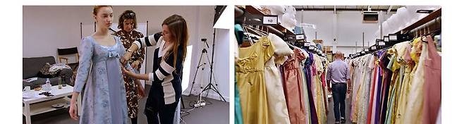 지금까지 보지 못했던 시대극과 이를 반영한 영국 리젠시 시대의 매력적인 의상들. 영화 <원초적 본능>, <쇼걸>, <위대한 쇼맨> 그리고 <말레피센트>의 의상을 제작한 코스튬 디자이너 엘른 미로즈닉은 브리저튼의 스토리에 꼭 맞는 의상을 찾기 어려워 모든 의상을 직접 제작했다. 영국, 이탈리아, 스페인, 뉴욕, 부다페스트에 이르기까지 세계 곳곳에서 공수한 의상들로 캐릭터와 극 중 스토리에 맞게 디자인했고 무려 7500여 벌의 의상들이 시즌 1에서 선보여졌다. 그 중 다프네 역의 피비 디네버가 입은 드레스는 총 100여 벌. 특히 그녀의 감성과 사랑에 빠져들며 변화하는 감정을 표현하기 위해 시어한 소재부터 화려한 자수가 수놓여진 실크 등의 블루 톤의 의상들을 적극 활용했다.